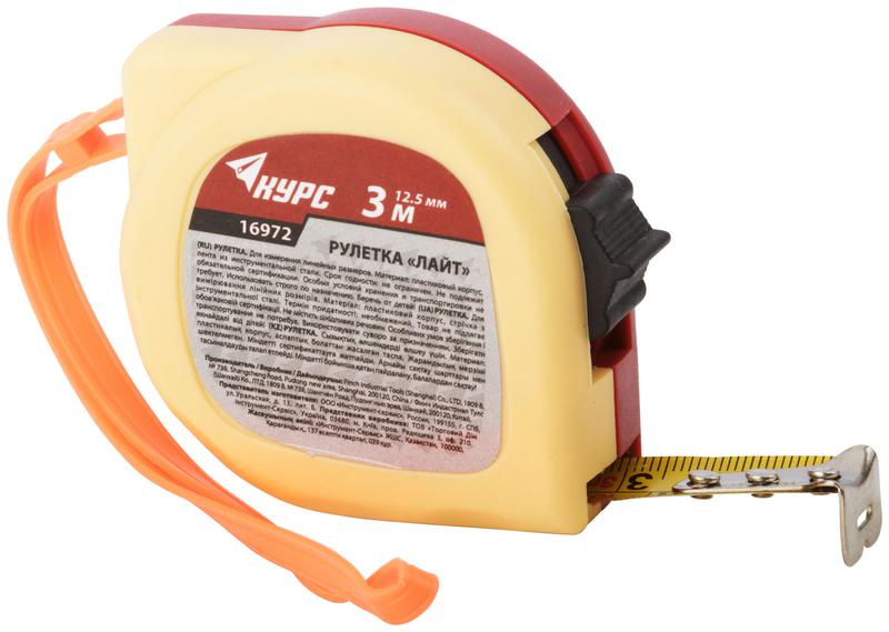 Рулетка КУРС серии "Лайт" предназначена для измерений линейных размеров. Корпус рулетки изготовлен из ударопрочного ABS-пластика, устойчивого к механическим воздействиям. Рулетку можно крепить на ремне с помощью металлической клипсы. Тканевый ремешок позволяет носить рулетку на руке или хранить в подвешенном положении.