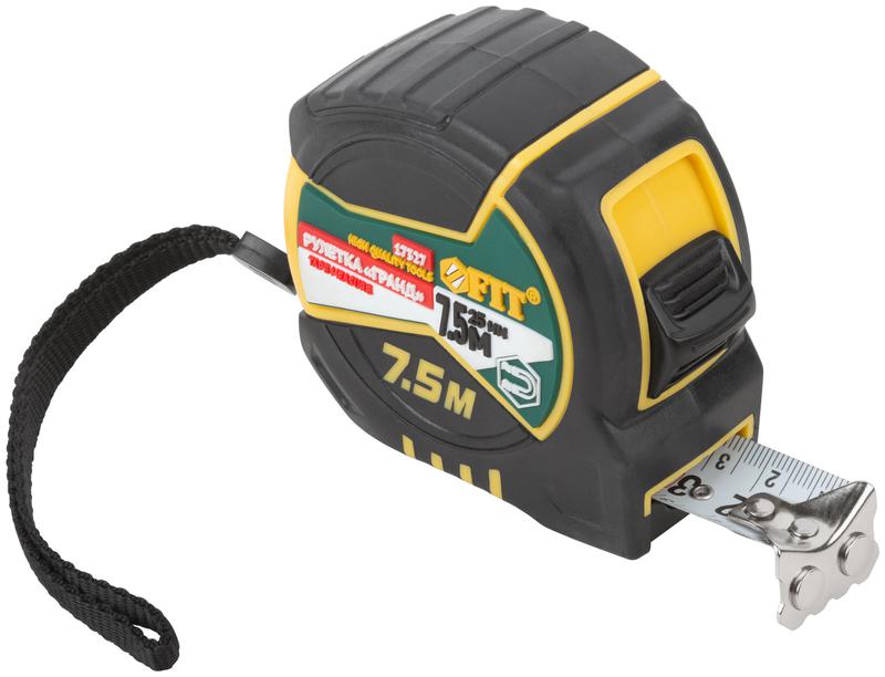 «Гранд». Калиброванная лента класс II, двойной стопор, магнитный крючок. Материал: стальная лента с нейлоновым покрытием, прорезиненный корпус из ударопрочного ABS пластика. Упаковка: пластиковый подвес.