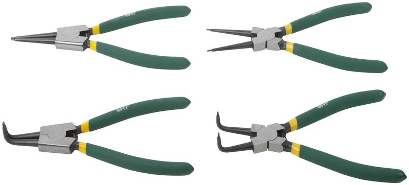L=170 мм. Для установки и снятия стопорных колец. В наборе 4 разжима: внешний прямой, внешний угловой, внутренний прямой, внутренний угловой. Материал: инструментальная сталь, ручки с ПВХ покрытием. Упаковка: блистер.