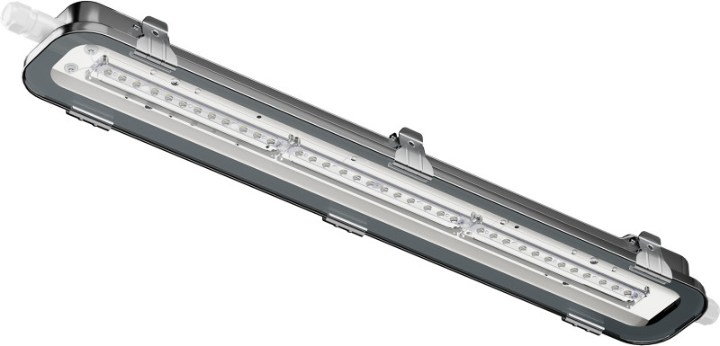 Штампованный корпус из нержавеющей стали марки AISI304 позволяет эксплуатировать светильник в тяжелых условиях. Силиконовый уплотнитель и клипсы жесткой фиксации надежно притягивают стекло к корпусу, что обеспечивает степень защиты IP66/IP67. Кабельный ввод с интегрированной клеммной колодкой позволяет подключать светильники без разбора корпуса и упрощает монтаж светильников в линию.