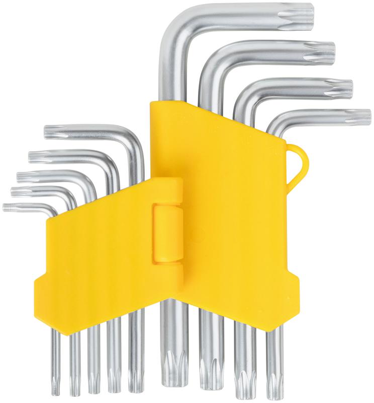 Для работы с крепежными элементами. Закалка ключей до твердости 50-54 HRC обеспечивает высокую износостойкость. Хромированное антикоррозийное покрытие. Две рабочие стороны повышают эффективность работы в труднодоступных местах. 9 размеров в наборе способствуют выполнению широкого спектра задач. Эргономичный складной пластиковый держатель с подвесом позволяет организованно хранить ключи. Маркировка на ключах и держателе облегчают идентификацию.