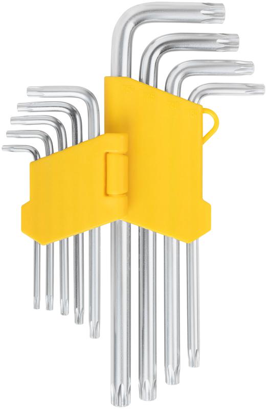 Для работы с крепежными элементами. Закалка ключей до твердости 50-54 HRC обеспечивает высокую износостойкость. Хромированное антикоррозийное покрытие. Две рабочие стороны повышают эффективность работы в труднодоступных местах. 9 размеров в наборе способствуют выполнению широкого спектра задач. Эргономичный складной пластиковый держатель с подвесом позволяет организованно хранить ключи. Маркировка на ключах и держателе облегчают идентификацию.