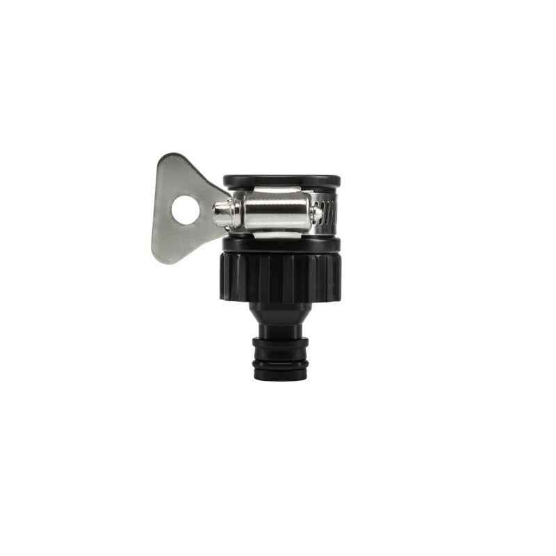 При затяжке хомут прижимает адаптер к крану, что предотвращает протекание и обеспечивает надежное и долговечное соединение.