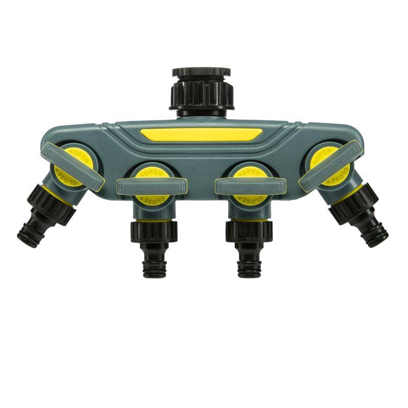 Разветвитель предназначен для подключения четырех шлангов через коннекторы к крану с внешней резьбой. Обеспечивает независимое управление четырьмя отдельными поливочными линиями, что позволяет адаптировать полив под различные потребности растений и зон.
