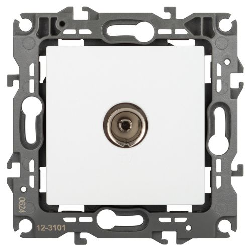 Розетка телевизионная одиночная серии Эра 12 скрытой установки механизм цвет белый матовый 12-3101-01М. Сделана из поликарбоната. Монтаж в подрозетник производится и на лапки, и на винты. Рамки приобретаются отдельно.