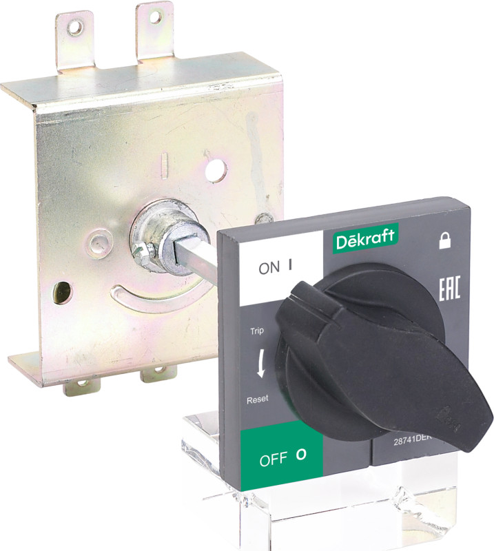 Ручка поворотная на дверь шкафа РП-306Rc; состоит из ручки, удлинительной оси и поворотной рукоятки; предназначена для ручного дистанционного переключения (включения и отключения) автоматического выключателя серии ВА-306Rc без открытия двери шкафа.