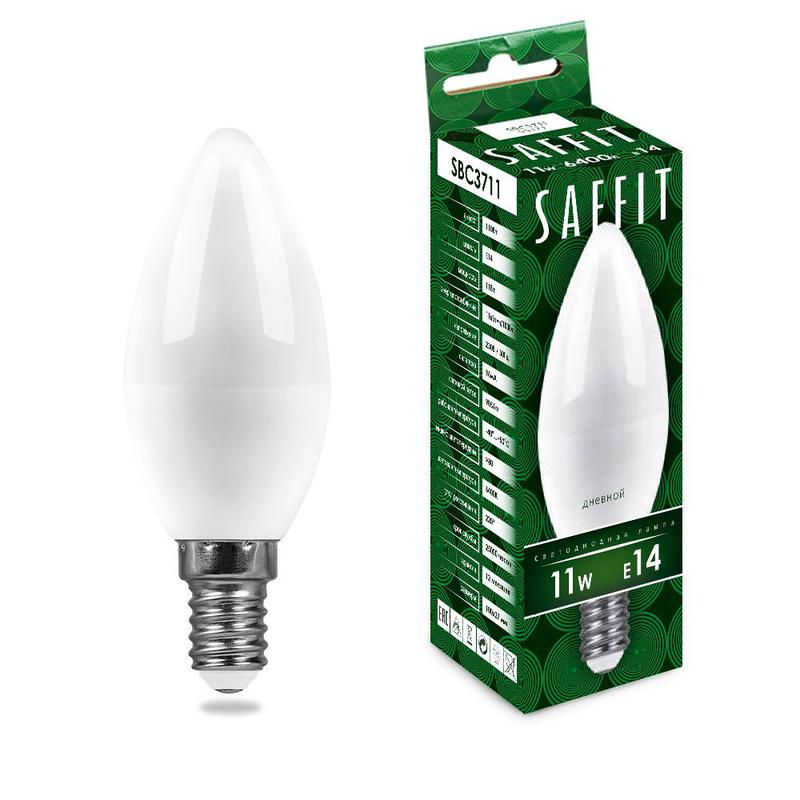 Лампа светодиодная SAFFIT SBC3711, C37 (свеча), 11W 230V E14 6400К (дневной), рассеиватель матовый белый, 905Lm, угол рассеивания 220°, корпус пластик, 100*37мм