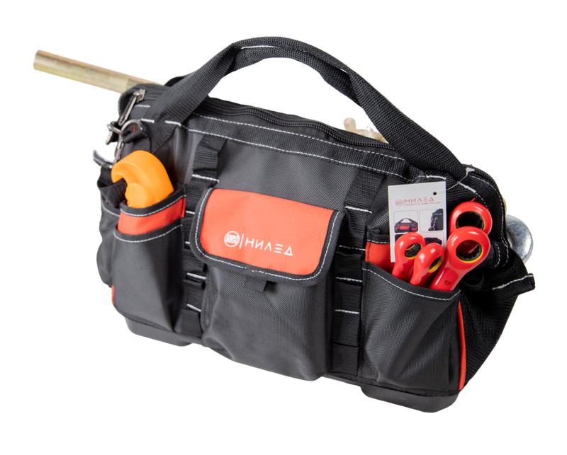Наличие рукоятей и плечевого ремня, обеспечивают удобную транспортировку инструмента на дальнее расстояние. Благодаря жесткому дну, сумка наполненная изделиями не теряет своей формы и исключает повреждение материала сумки инструментом, имеющим острые кромки металлических элементов.