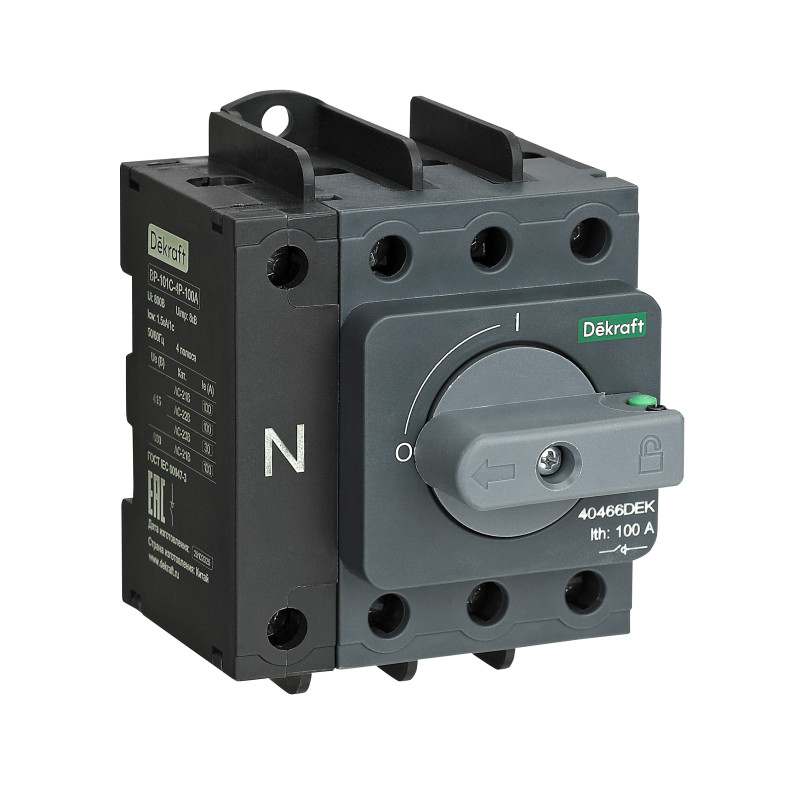 Выключатель-разъединитель Dekraft серии ВР-100С, типа ВР-101С; 4P; номинальный ток 63 А; типоразмер 100А; ном.напряжение до 690 В, 50/60 Гц. Компактный размер и монтаж на DIN-рейку. Подвод питания возможен как сверху, так и снизу аппарата.