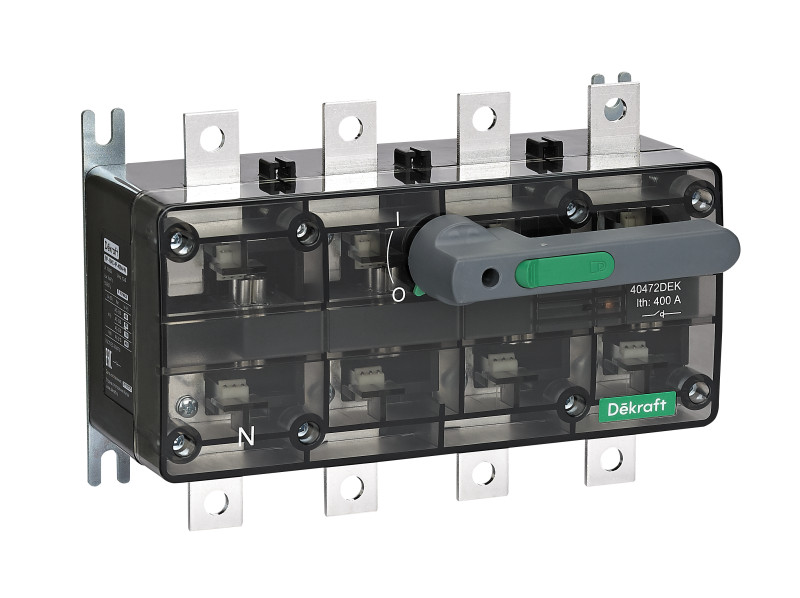 Выключатель-разъединитель Dekraft серии ВР-100С, типа ВР-104С; 4P; номинальный ток 250 А; типоразмер 400А; ном.напряжение до 690 В, 50/60 Гц. Прозрачный корпус для обеспечения видимомго разрыва. Подвод питания возможен как сверху, так и снизу аппарата.