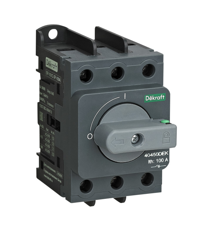 Выключатель-разъединитель Dekraft серии ВР-100С, типа ВР-101С; 3P; номинальный ток 80 А; типоразмер 100А; ном.напряжение до 690 В, 50/60 Гц. Компактный размер и монтаж на DIN-рейку. Подвод питания возможен как сверху, так и снизу аппарата.