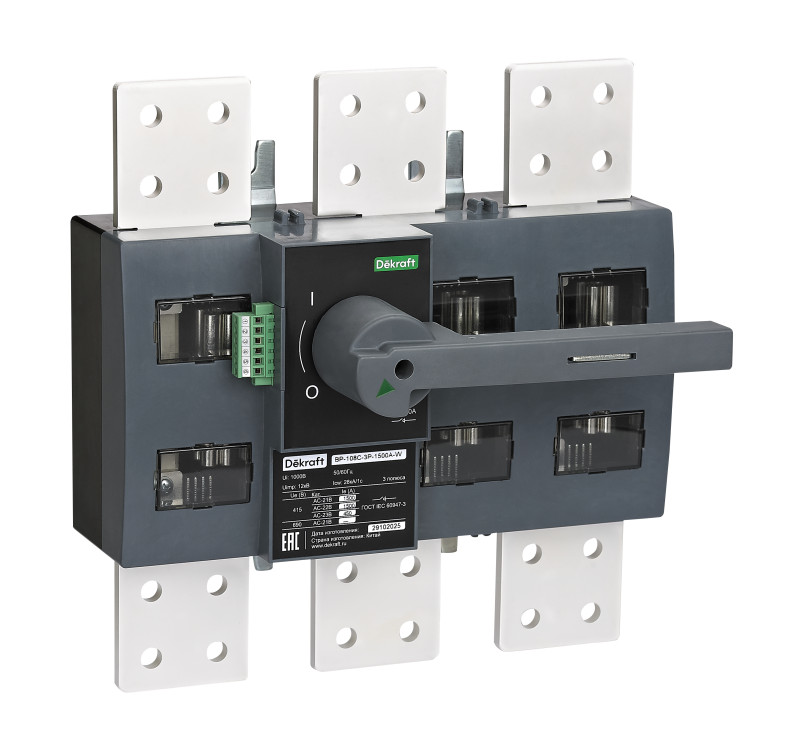 Выключатель-разъединитель Dekraft серии ВР-100С, типа ВР-108С; 3P; номинальный ток 1250 А; типоразмер 1500А; ном.напряжение до 690 В, 50/60 Гц. Окна видимого разрыва. Дополнительный контакт 2НО2НЗ в стандартной комплектации. Подвод питания возможен как сверху, так и снизу аппарата.