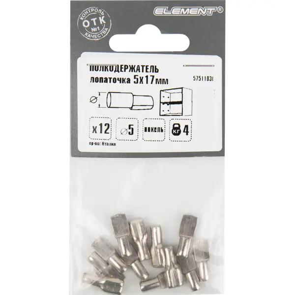 Полкодержатель «Лопаточка» изготовлен из металла и предназначен для установки полок в корпусной мебели. Изделие не может использоваться для стеклянных полок. Установка самого держателя выполняется в отверстия стенок диаметром 5 мм. Такие крепления рассчитаны на умеренные нагрузки из-за небольшой площади опоры. Мы предлагаем купить их набором из 12 штук. Наша цена полкодержателей «Лопаточка» максимально выгодна для покупателя. Преимущества: - точные размеры и геометрия держателя; - простая установка; - неограниченный срок службы.