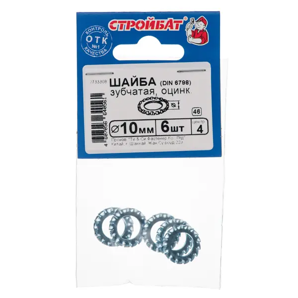 **Шайба зубчатая DIN 6798 М10** — крепежный метиз, предназначенный для резьбовых соединений в комплекте с болтами, гайками и винтами. Металлическое изделие имеет зубья, выступающие наружу, что позволяет увеличить прижимную площадь крепежного узла и предотвратить откручивание основного крепежного элемента под воздействием нагрузок. ### Основные характеристики - Диаметр — 10 мм. В упаковке 6 штук. - Используется для крепления различных деталей и узлов в промышленности, строительстве, производстве мебели. - Шайбы изготавливаются из пружинной стали и защищаются от коррозии с помощью оцинкования — это значительно повышает срок службы изделия.