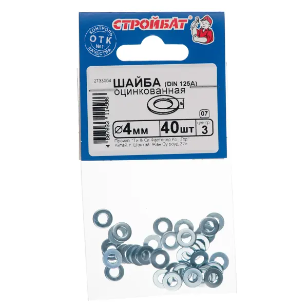 **Шайба DIN 125A М4** — стальной крепежный элемент, соответствующий европейскому стандарту DIN 125, имеющий класс точности А. Диаметр шайбы — 4 мм. В упаковке 40 штук. ### Основные характеристики - Класс точности А обеспечивает высокое качество устройства крепежных узлов и малую деформированность изделий. - Шайба имеет круглую форму с отверстием с закругленными краями, используется в комплекте с основными крепежными элементами — саморезами, гайками, болтами и винтами. Использование шайбы в качестве прокладки позволяет уменьшить давление на поверхность и предотвращает самопроизвольное раскручивание основного крепежного элемента. - Шайбы изготавливаются из стали, покрытой слоем цинка, что эффективно защищает от коррозионных воздействий и намного повышает долговечность металлических изделий и крепежных узлов.
