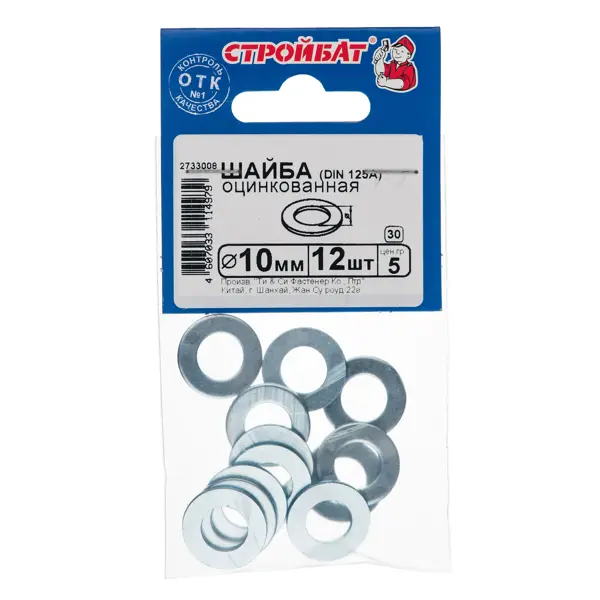 **Шайба DIN 125A М10** — стальной крепежный элемент, соответствующий европейскому стандарту DIN 125, имеющий класс точности А. Диаметр шайбы — 10 мм. В упаковке 12 штук. ### Основные характеристики
