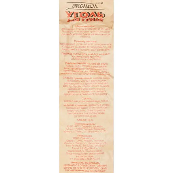 Древесного угля для гриля объемом 26 литров хватит на несколько пикников в кругу семьи. Самостоятельно рубить дрова не придётся. Удобная упаковка легко поместится в багажнике легкового автомобиля и не займёт много места. В упаковке — сухие комья древесного угля небольших размеров, легко разгораются во время разведения костра, помещаются даже в самый миниатюрный мангал. Отличная покупка для туристических походов в горы и лес. Лучшая экономия денег. Преимущества: - удобен в транспортировке; - легко разгорается. **БЕРЕЖНО К ЛЮДЯМ, БЕРЕЖНО К ПРИРОДЕ** - Товар сертифицирован по добровольному лесному стандарту*, что подтверждает ответственное происхождение древесины без незаконных вырубок, восполнение лесных ресурсов, защиту биоразнообразия, соблюдение прав работников и интересов местных сообществ. *Ищите маркировку на упаковке товара: Лесной эталон, НСЛС, FSC и PEFC.