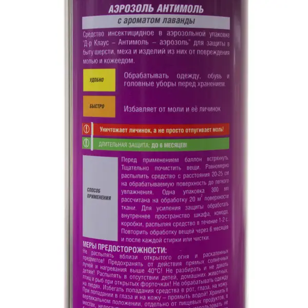 | Состав | ДВ - перметрин - 0,25%, отдушка (0,25%),растворитель, углеводородный пропеллент. |