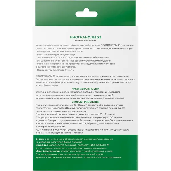 **Состав:** Ферментно-микробиологическая композиция, нанесенная на инертный носитель в форме порошка. **Особенности и преимущества:** - Обеспечивают устранение неприятных запахов органического происхождения; - Разжижают и разлагают продукты жизнедеятельности человека в выгребных ямах дачных туалетов; - Перерабатывают туалетную бумагу; - Не отравляют окружающую среду. **Предназначение:** Запускают и поддерживают дачный туалет в рабочем состоянии. Избавляют от неудобств, связанных с откачкой резервуаров и засорением труб. **Применение:** При регулярном использовании 25 г (1 пакет) развести в 2 л воды комнатной температуры. Выдержать 20 минут. Залить в дачный туалет, после чего система готова к использованию. Для запуска новой системы дачного туалета достаточно 50 г (2 пакета). 100 г (4 пакета) обеспечивают переработку 4-6 куб. м жидких отходов в течение месяца для семьи из 4 человек. **4 класс опасности (малоопасные)**
