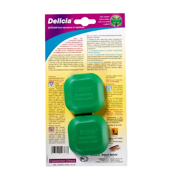 Бокс-приманка от муравьёв Delicia защитит от муравьев квартиру, дом, дачу, сад. Производитель — немецкая фирма Frunol Delicia, которая принадлежит к ведущим производителям инсектицидов. Их продукция известна своим высоким качеством. На муравьев быстро воздействует химическое вещество хлорпирифос, входящее в состав приманки. Успех борьбы с насекомыми зависит от правильности применения Delicia. Бокс активируется при повороте крышки, её не следует полностью снимать. Приманка должна быть защищена от влаги. В нижней части бокса есть клейкая лента, с её помощью его можно прикрепить к вертикальной поверхности. Бокс-приманка от муравьёв Delicia гарантирует избавление от муравьев за невысокую цену. Преимущества: - высокая эффективность; - простота применения; - быстрота воздействия.