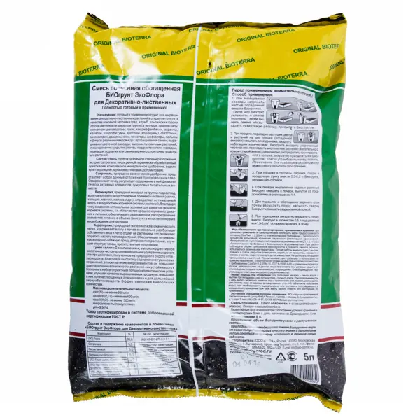 Биогрунт предназначен для выращивания декоративно-лиственных растений в помещениях, зимних садах, открытых грунтах и на балконах. Применим для разведения цветочной и овощной рассады, проращивания семян, мульчирования почвы, а также посадки, пересадки и замены верхнего слоя грунта у растущих насаждений. В состав входят: смесь различных торфов, сапропель, удобрение «ФлорГумат», вермикулит, песок и доломитовая мука. Приемлемая концентрация питательных веществ и микроэлементов обеспечивает полноценное и правильное развитие растений. Для каждого отдельного процесса работы с почвой существуют рекомендации, которым необходимо следовать. Преимущества: - качественный состав;
