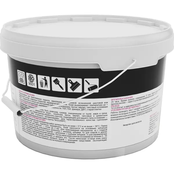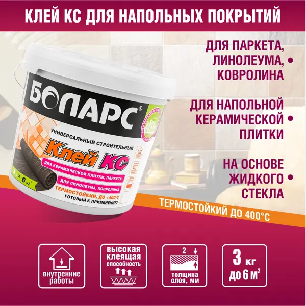 Клей строительный БОЛАРС КС – универсальный состав на силикатной основе для надежного приклеивания различных напольных покрытий. Применяется только на горизонтальных основаниях в помещениях с нормальной влажностью. Подходит для монтажа паркета, линолеума на тканевой, вспененной, джутовой или войлочной основе, ковровых покрытий, керамических плиток. Клей термостойкий, выдерживает температуру до +400°С. Обладает высокой клеящей способностью. Не содержит растворителей, безопасен для здоровья человека и окружающей среды. Применяется для внутренних работ. **Область применения:** - паркет; - линолеум; - ковровые покрытия; - керамическая плитка. **Основания** Рекомендуемые основания: бетон, кирпич, гипсовые основания (в том числе оштукатуренные), деревянные поверхности, ГКЛ, ГВЛ, фанера, ДВП, старая плитка. Не рекомендуется применять на основаниях, подверженных постоянному контакту с водой. **Характеристики и назначение:** - термостойкий до 400°С; - цвет – светло-бежевый;