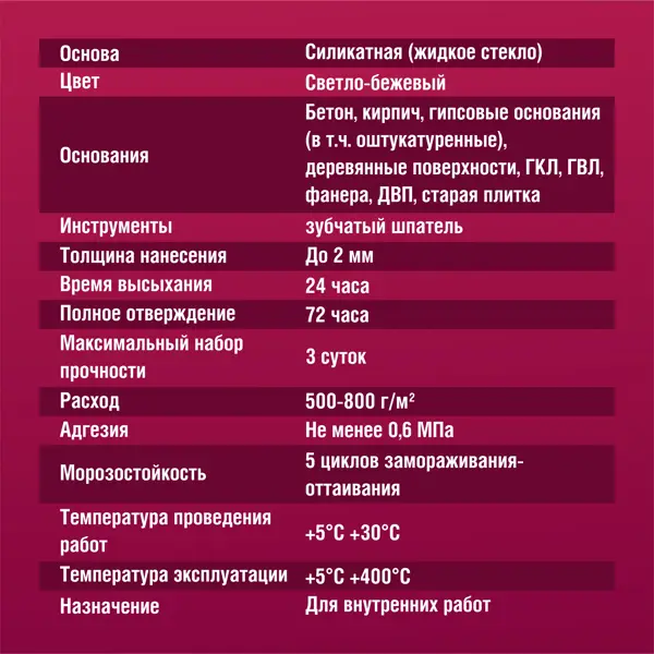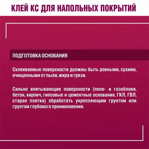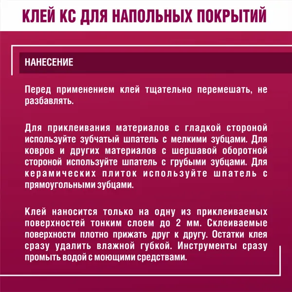 Клей строительный БОЛАРС КС – универсальный состав на силикатной основе для надежного приклеивания различных напольных покрытий. Применяется только на горизонтальных основаниях в помещениях с нормальной влажностью. Подходит для монтажа паркета, линолеума на тканевой, вспененной, джутовой или войлочной основе, ковровых покрытий, керамических плиток. Клей термостойкий, выдерживает температуру до +400°С. Обладает высокой клеящей способностью. Не содержит растворителей, безопасен для здоровья человека и окружающей среды. Применяется для внутренних работ. **Область применения:** - паркет; - линолеум; - ковровые покрытия; - керамическая плитка. **Основания** Рекомендуемые основания: бетон, кирпич, гипсовые основания (в том числе оштукатуренные), деревянные поверхности, ГКЛ, ГВЛ, фанера, ДВП, старая плитка. Не рекомендуется применять на основаниях, подверженных постоянному контакту с водой. **Характеристики и назначение:** - термостойкий до 400°С; - цвет – светло-бежевый;