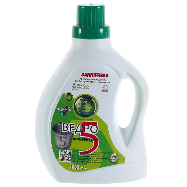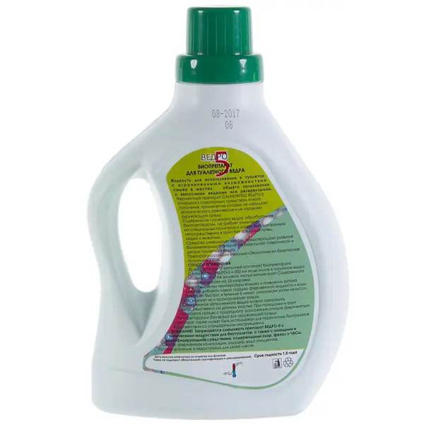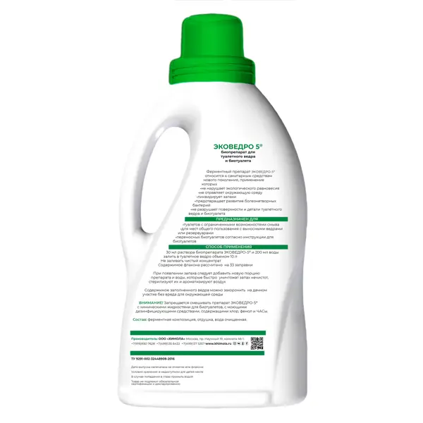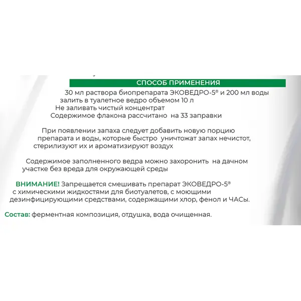 **Состав:** Ферментная композиция, отдушка, вода очищенная. **Особенности и преимущества:** - Ликвидирует запахи; - Предотвращает развитие болезнетворных бактерий; - Не требует утилизации на специальных полигонах; - Не разрушает поверхности и детали туалетного ведра и биотуалета; - Не отравляет окружающую среду. **Предназначение:** - Для туалетов с ограниченными возможностями смыва; - Для мест общего пользования с выносными ведрами или резервуарами; - для переносных биотуалетов согласно инструкции для биотуалетов. **Применение:** 33 мл раствора биопрепарата Эковедро-5 и 200 мл воды залить в туалетное ведро объемом 10 л. **4 класс опасности (малоопасные)**
