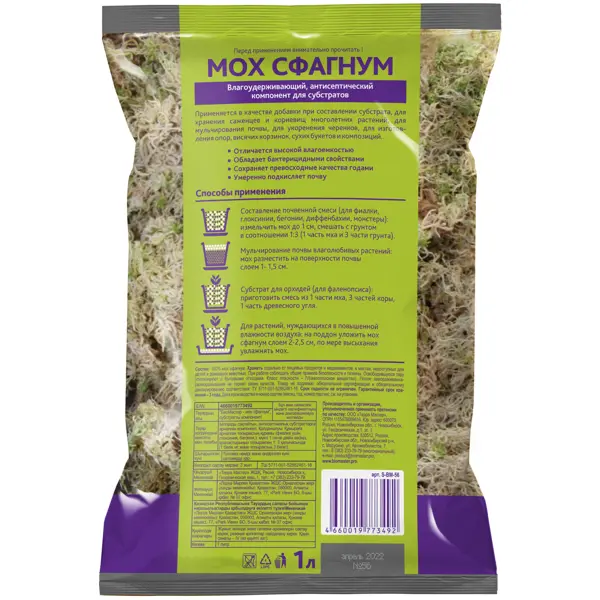 Мох сфагнум — один из обязательных компонентов субстрата для многих растений. Он не содержит питательных веществ, но делает грунт более легким и рыхлым. Благодаря сфагнуму в почве задерживается достаточное количество влаги, но при этом она не закисает. Кроме того, мох впитывает в себя излишки солей и препятствует появлению грибковых заболеваний у растений, т. к. обладает бактерицидным действием. Сфагнум часто используется и при декорировании цветочных композиций. Преимущества: - удобен для размножения растений отводками и черенками; - доступная цена; - высокая воздухо- и влагопроницаемость.