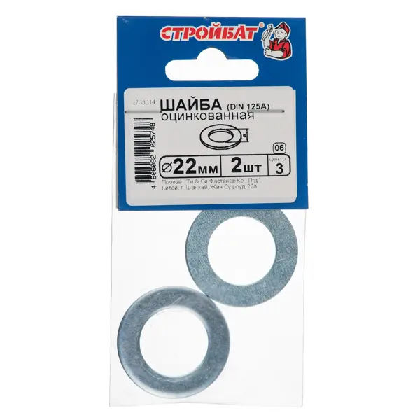 **Шайба DIN 125A М22** — стальной крепежный элемент, соответствующий европейскому стандарту DIN 125, имеющий класс точности А. Диаметр шайбы — 22 мм. В упаковке 2 штуки. ### Основные характеристики - Класс точности А обеспечивает высокое качество устройства крепежных узлов и малую деформированность изделий. - Шайба имеет круглую форму с отверстием с закругленными краями, используется в комплекте с основными крепежными элементами — саморезами, гайками, болтами и винтами. Использование шайбы в качестве прокладки позволяет уменьшить давление на поверхность и предотвращает самопроизвольное раскручивание основного крепежного элемента. - Шайбы изготавливаются из стали, покрытой слоем цинка, что эффективно защищает от коррозионных воздействий и намного повышает долговечность металлических изделий и крепежных узлов.