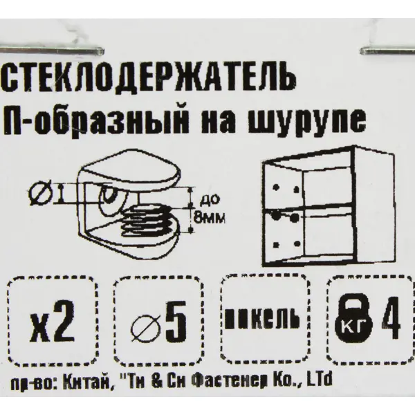 Стеклодержатель мебельный П-образный на шурупе, металл, цвет хром, 2 шт.
