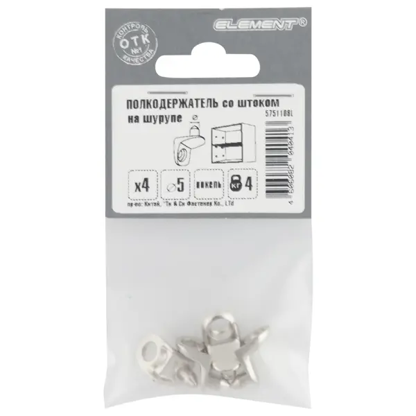 Полкодержатель со штоком на шурупе изготовлен из хромированного металла. Данный материал не обладает большим весом, но выдерживает мощные механические нагрузки, что позволяет изделию не ломаться при значительном весе полок. Преимущества: - не окисляется и не вступает в реакцию с водой, что позволяет использовать его даже в помещениях с повышенной влажностью воздуха; - отличается долговечностью и износостойкостью, не требуя частой замены; - при загрязнениях можно очищать любым чистящим средством, поскольку изделие не обладает химической активностью; - фасуется в упаковки по 4 штуки.