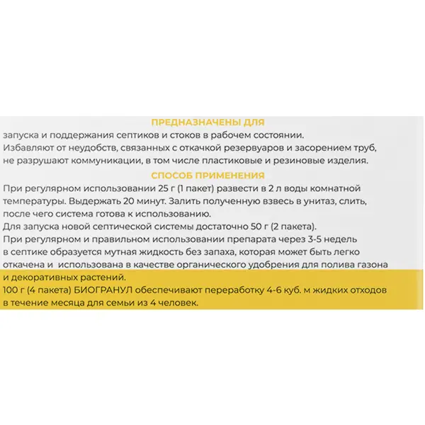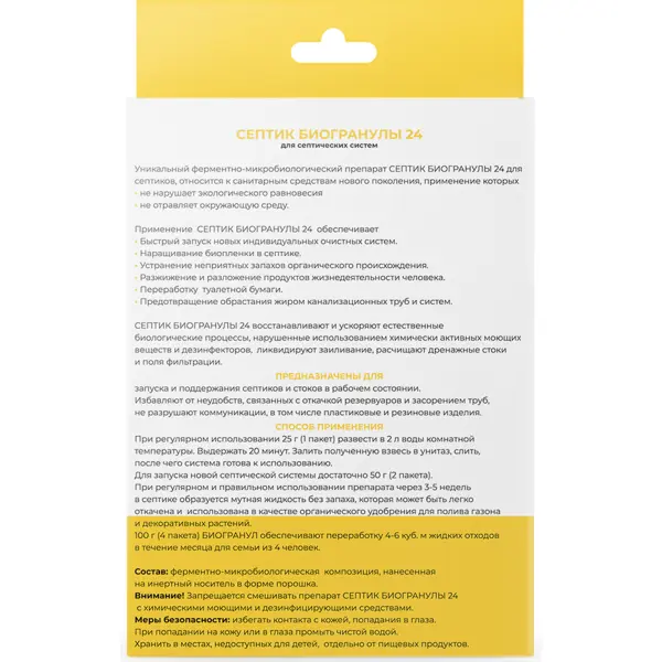 **Состав:** Ферментно-микробиологическая композиция, нанесенная на инертный носитель в форме порошка. **Особенности и преимущества:** - Быстро запускают новые индивидуальные очистные системы; - Наращивают биопленку в септике; - Разжижают и разлагают продукты жизнедеятельности человека; - Ликвидируют неприятные запахи органического происхождения; - Перерабатывают туалетную бумагу; - Предотвращают обрастание жиром канализационных труб и систем; - Ликвидируют заиливание, расчищают дренажные стоки и поля фильтрации - Не отравляют окружающую среду. **Предназначение:** Для запуска и поддержания септиков и стоков в рабочем состоянии. **Применение:** При регулярном использовании 25 г (1 пакет) развести в 2 л воды комнатной температуры. Выдержать 20 минут. Залить полученную взвесь в унитаз, слить, после чего система готова к использованию. Дла запуска новой септической системы достаточно 50 г (2 пакета). 100 г (4 пакета) обеспечивают переработку 4-6 куб. м жидких отходов в течение месяца для