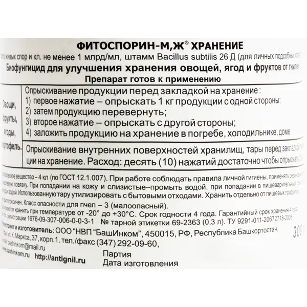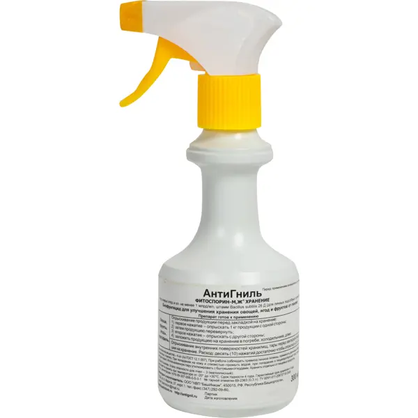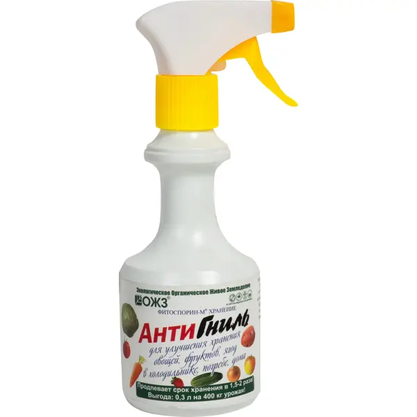 **Средство против гнили для садовых растений «Антигниль» 0.3 л** - природный препарат для защиты овощей, фруктов и ягод от гнилей при хранении и транспортировке. **Состав:** Бактериальная споровая культура Bacillus subtilis 26Д, титр живых спор и клеток не менее 1 млрд/мл. **Преимущества:** - АнтиГниль не содержит химических добавок, безопасна для человека и не имеет срока ожидания. Вы можете употреблять в пищу овощи и фрукты в день обработки. - Продлевает срок хранения в 1,5 - 2 раза. - Экономный расход (до 100 кг урожая). **Назначение:** Биопрепарат АнтиГниль эффективно защищает урожай от разнообразных гнилей и токсинов с помощью специально отобранных бактерий Bacillus subtilis, обученных противостоять болезнетворным микроорганизмам, вызывающим порчу плодов. Овощи, обработанные препаратом АнтиГниль, хранятся дольше: картофель и морковь на 70 дней, перец на 17 дней, яблоки на 14 дней. **Класс опасности:** 4 (Малоопасный).