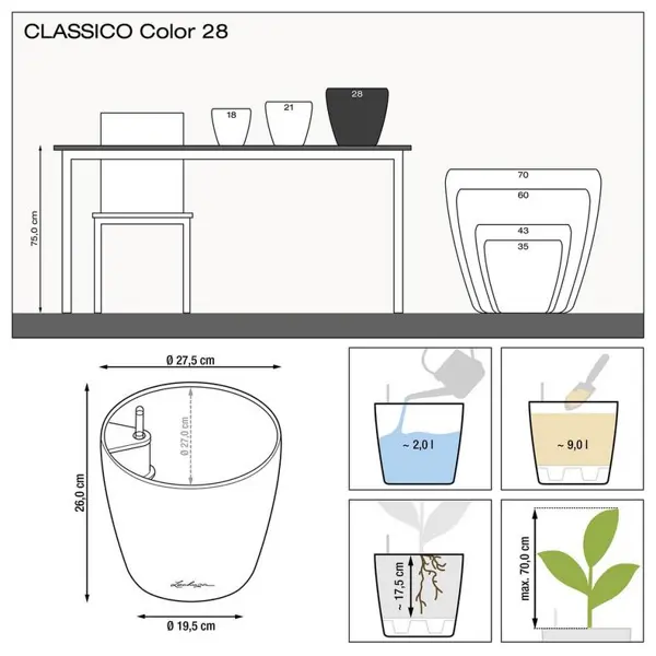 **Кашпо для цветов Lechuza Классико колор 13190 ø28 см пластик белый** - это напольное кашпо, дополненное системой автополива. Благодаря своей форме, сдержанному матовому цвету и современному дизайну оно прекрасно подойдет для гостиной, спальни, балкона и террасы. Кашпо CLASSICO Color убедительны в своей эстетике, высококачественном пластике и умных функциях. Надежная система автополива Lechuza снабжает растения влагой, как в природе, а на открытых площадках выкрученный винт из днища кашпо защищает корни растения от застоя влаги после дождя. Стильный дизайн и шелковистая матовая поверхность в гармоничном цвете создают отличное обрамление для комнатных или уличных растений. **Особые преимущества:** - Система автополива. - Дренаж в комплекте. - Второе дно (сепаратор). - УФ и морозоустойчивое.