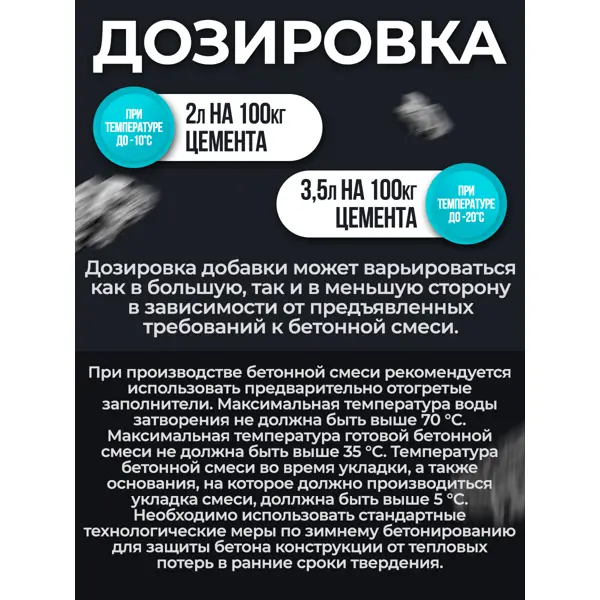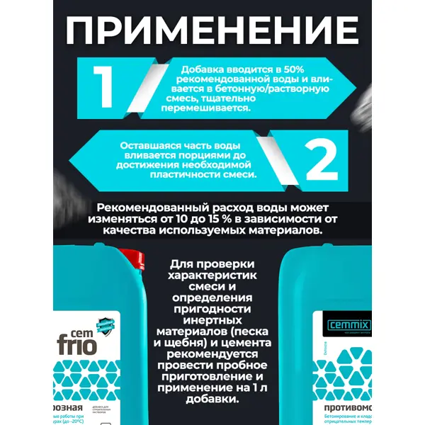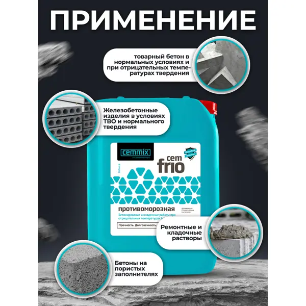 Противоморозная добавка CemFrio используется при проведении строительных работ в условиях низких температур. Она обладает противоморозным, ускоряющим и пластифицирующим действием, подходит для бетона и строительных растворов. Позволяет работать при температуре до -20°C. Способствует увеличению прочности бетонной смеси на 10%, повышает сцепку с металлоизделиями и арматурой, поэтому, купив противоморозную добавку, можно значительно сократить расходы на проведение сопутствующих работ. Преимущества: - прочность; - морозостойкость; - водоупорность; - высокая эффективность.