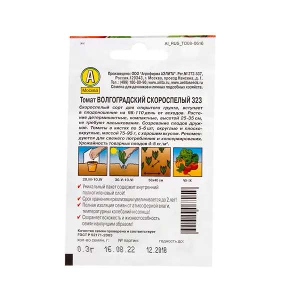 **Томат «Волгоградский скороспелый» 323** — ранний сорт, дающий первый урожай через три с половиной месяца после всходов. Невысокие компактные растения не требуют пасынкования. Кисти по 5-6 помидоров в каждой формируются практически одновременно. Широкие округлые плоды содержат вкусную сочную мякоть. Благодаря компактным размерам томаты удобно консервировать. ### Особенности - Помидор весит до 95 г. - На квадратном метре собирают до 5 кг урожая. - Рассаду высаживают в марте-апреле. - Растение выращивается в открытом грунте.
