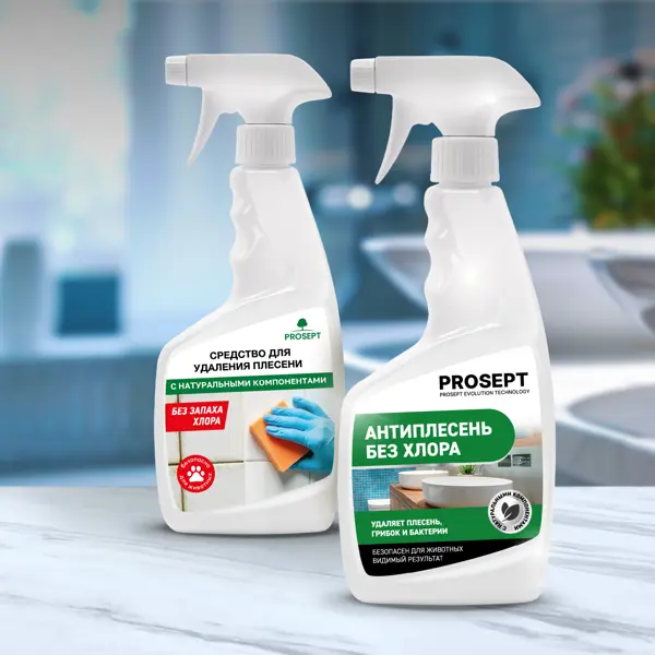 **Средство для удаления плесени Prosept без хлора** – готовый состав для удаления плесени в ванных комнатах, душевых, а также очистки полков в банях и саунах от загрязнений. Может применяться для выведения пятен от чая, кофе, фруктов, вина с текстиля, одежды и ковровых покрытий. **Преимущества:** - не содержит химических веществ, запрещенных к использованию в РФ; - без хлора; - содержит активный кислород. **Способ применения:** - Насадку распылителя повернуть в положение «Spray». - Распылить средство на сухую поверхность до полного ее увлажнения. - При сильных загрязнениях и плесневых поражениях выдержать несколько часов или оставить на ночь. - Для очистки тканей дать подействовать 15-20 минут, затем постирать. **Состав:** вода, пероксид водорода менее 5%, изопропиловый спирт, АПАВ менее 5%, фосфонаты менее 5%.