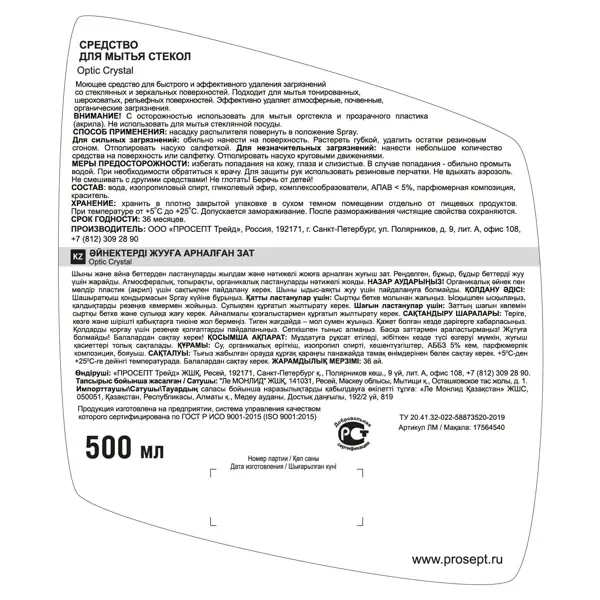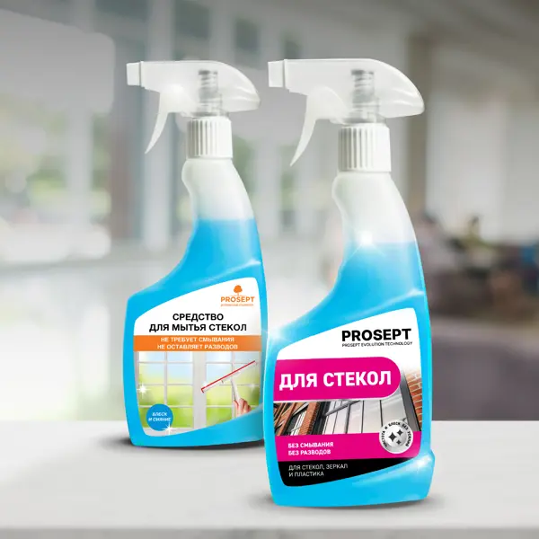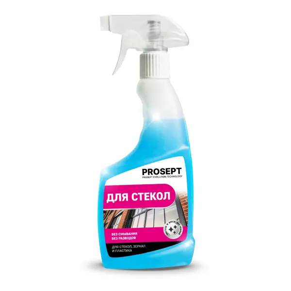 **Средство для мытья стёкол Prosept** – удобный и эффективный спрей для очистки стеклянных поверхностей, в том числе тонированных и зеркальных. Средство может использоваться для любых стеклянных поверхностей: окон, зеркал, деталей мебели и интерьера и т.д. **Преимущества:** - не оставляет разводов на стекле; - не требует смывания после использования; - придает очищенным поверхностям блеск. **Способ применения:** - Насадку распылителя повернуть в положение «Spray». - Для сильных загрязнений: обильно нанести на поверхность. Растереть губкой, удалить остатки резиновым сгоном. Отполировать сухой чистой салфеткой. - Для незначительных загрязнений: нанести небольшое количество средства на поверхность или салфетку. Отполировать насухо круговыми движениями. **Состав:** вода, орагический растворитель, изопропиловый спирт, комплексообразователи, АПАВ менее 5%, парфюмерная композиция, краситель.