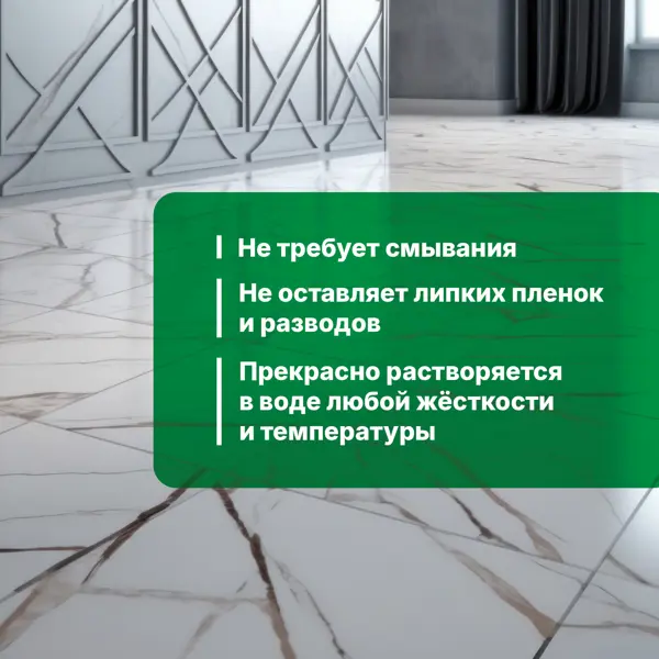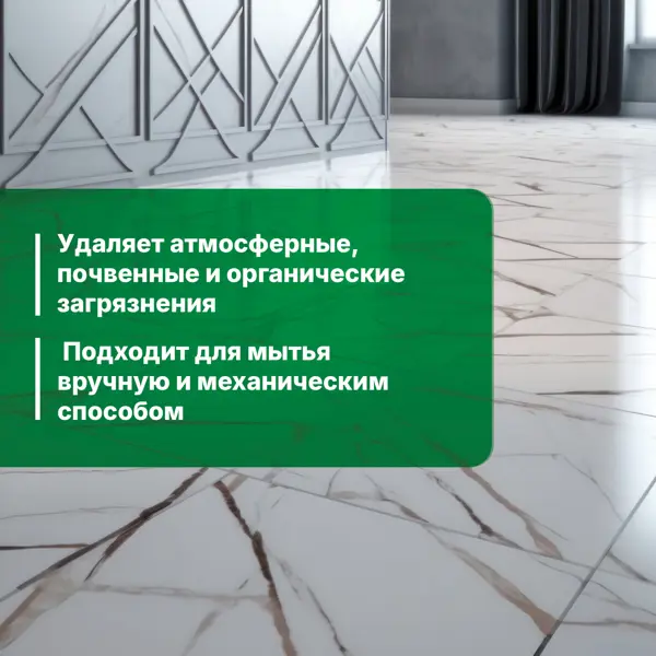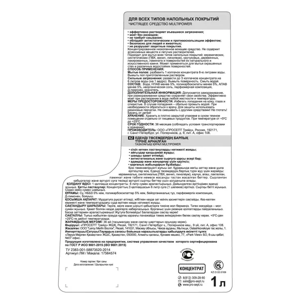 **Средство для мытья пола Prosept** предназначено для мытья всех типов напольных покрытий: керамических, синтетических (ПВХ, винил, линолеум), деревянных, лакированных, поверхностей из натурального и искусственного камня. **Преимущества:** - обладает антистатическим и противоскользящим эффектом; - не требует смывания; - безопасен для людей и животных. **Способ применения:** - 1 колпачок концентрата развести на 6 л воды. Вымыть пол приготовленным раствором. При сильных загрязнениях увеличить концентрацию. **Состав:** вода, НПАВ менее 5%, поликарбоксилаты менее 5%, АПАВ менее 5%, неорганическая соль, парфюмерная композиция, Д-лимонен, краситель. Подробнее о том, [**как навести порядок на даче весной**](/advice/kraski/kak-navesti-poryadok-na-dache-vesnoy-podborka-sovetov/), читайте в нашей статье.