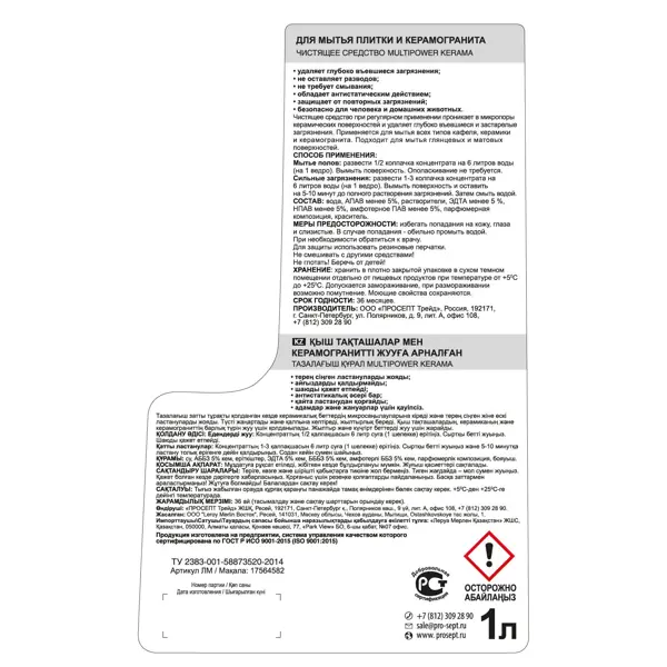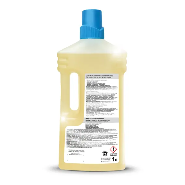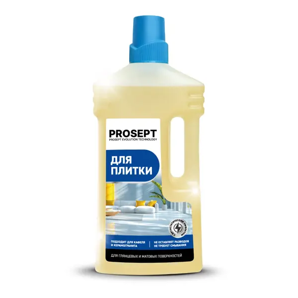 **Средство для мытья плитки и керамогранита Prosept** эффективно удаляет глубоко въевшиеся загрязнения различной природы. **Преимущества:** - удаляет глубоко въевшиеся загрязнения; - не оставляет разводов; - не требует смывания; - обладает антистатическим действием; - защищает от повторных загрязнений; - безопасен для человека и домашних животных. **Способ применения:** - Мытье полов: 1 колпачок концентрата развести на 6 л воды. Вымыть поверхность. Ополаскивание не требуется. - Сильные загрязнения: 2-4 колпачка концентрата развести на 6 л воды. Вымыть поверхность и оставить на 5-10 минут до полного растворения загрязнений. Затем смыть водой. **Состав:** АПАВ менее 5%, растворители, ЭДТА менее 5%, НПАВ менее 5%, амфотерное ПАВ менее 5%, парфюмерная композиция, краситель.