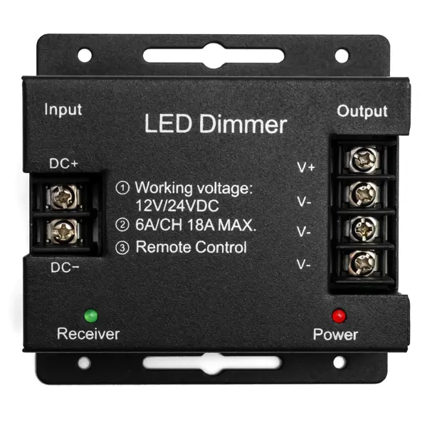 **Диммер для светодиодной ленты** — устройство для регулирования яркости освещения. Подходит для одноцветной ленты. Устанавливается между источником света и блоком питания (преобразователем). Прибор регулирует электрическую мощность, за счет чего изменяется яркость свечения ламп. ### Преимущества использования диммера - Позволяет изменять интенсивность свечения светодиодных ламп в большом диапазоне — за счет этого можно использовать один источник света для основного освещения и в качестве ночника. - Помогает сократить потребление электроэнергии и продлить срок службы светодиодов. - В комплекте есть сенсорный пульт управления, которым можно изменять яркость освещения из любой точки комнаты. ### Характеристики товара - Напряжение — 12 В. - Максимальная мощность — 216 Вт. - Цвет — черный. Подробнее о том, [**как выбрать и подключить светодиодную ленту**](/advice/osveshtenie/kak-vybrat-i-podklyuchit-svetodiodnuyu-lentu/), читайте в нашей статье. **БЕРЕЖНО К ЛЮДЯМ, БЕРЕЖНО К ПРИРОДЕ**