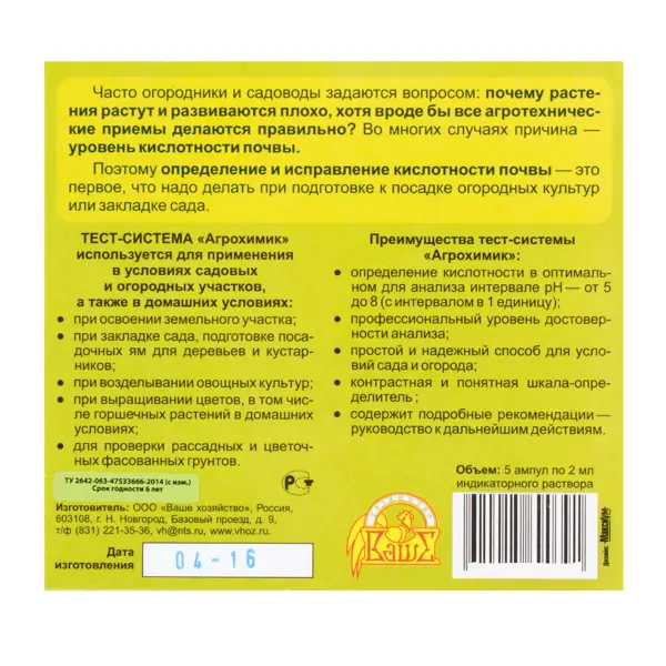 **Тест-система «Агрохимик»** — простое решение для определения кислотности почвы. От этого параметра зависит успех большинства начинаний садовода или огородника. В комплект входят ампулы с индикаторным раствором, шкалы цветов и фильтров из ваты. **Основные характеристики** - Ампулы с раствором — 5 шт. По 2 мл. - Тампоны — 5 шт. - Рабочий диапазон — от 5 до 8 pH. **Как использовать** Одна ампула предназначается для анализа 200 мл почвенной смеси. Пять-шесть столовых ложек земли заливают 0,5 л чистой воды и тщательно перемешивают. Через 20 минут раствор пропускают через вату. Затем наливают 200 мл в посуду с прозрачными стенками и добавляют материал из ампулы. Окраску сравнивают с показателями цветовой шкалы. К тесту прилагается подробная инструкция с полной технической информацией.