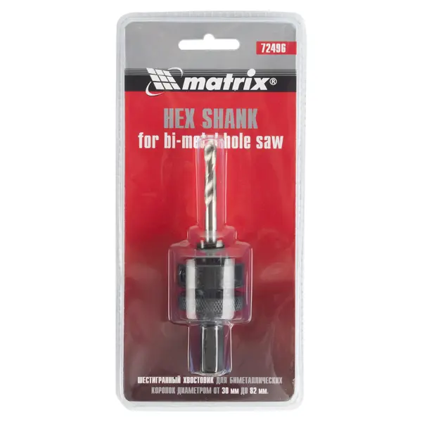 **Хвостовик для биметаллических коронок Matrix** применяется в качестве переходника между патроном дрели и коронкой. Позволяет легко и быстро заменить режущий инструмент, что сокращает общий срок строительно-ремонтных работ. **Особенности** Тип хвостовика — шестигранный. Диапазон размеров коронок — 32-82 мм. Хвостовик подходит как для несложных домашних работ, так и для профессионального применения на больших объемах. Поставляется с направляющим сверлом для более точного засверливания.