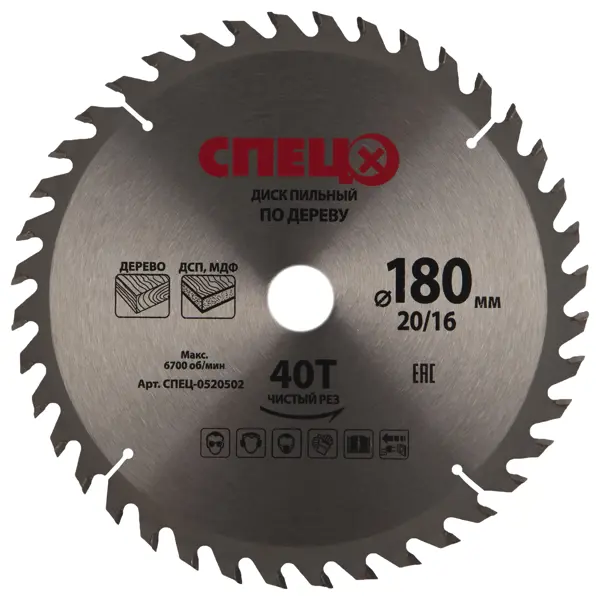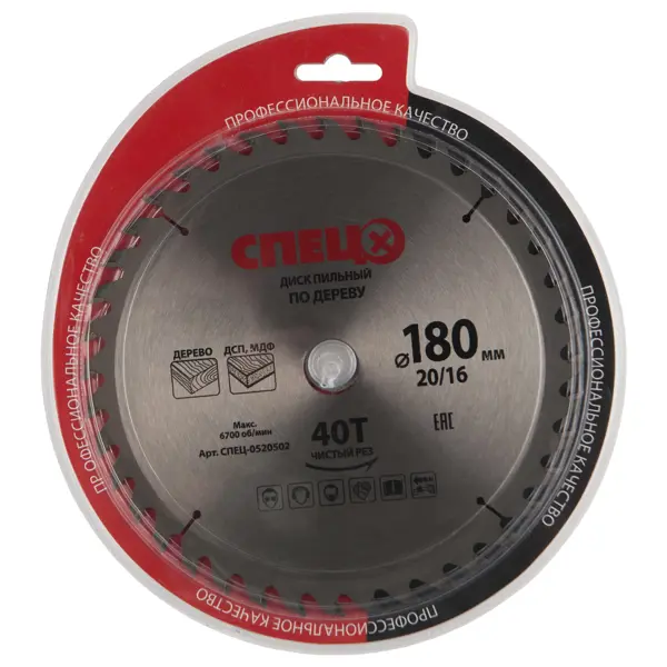 **Диск циркулярный по дереву «Спец»** — стальной круг диаметром 180 мм с 40 зубьями по периметру. Режущая кромка усилена твердосплавными напайками. Посадочный диаметр — 20 и 16 мм. Диск используется для реза (продольного и поперечного) заготовок из древесины, МДФ, ДСП. Устанавливается преимущественно на ручную дисковую пилу. Страна производства — Китай. Товар сертифицирован в Таможенном союзе: на полотне стоит аббревиатура EAC (Eurasian Conformity / Евразийское соответствие). ### Преимущества и особенности - Твердосплавные напайки повышают износостойкость и прочность, обеспечивают чистоту пропила. - Прорези компенсируют температурную деформацию стали. - Отверстия на концах прорезей уменьшают риск образования трещин. Внимание! Работы выполняйте в защитных очках, наушниках, респираторе и перчатках. Перед установкой и заменой циркулярного диска убедитесь, что пила не подключена к электросети.