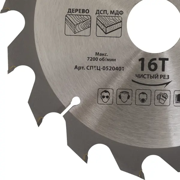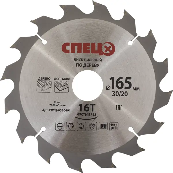 **Диск циркулярный по дереву «Спец»** — стальной круг диаметром 165 мм с 16 зубьями по периметру. Режущая кромка усилена твердосплавными напайками. Посадочный диаметр — 30 и 20 мм. Диск используется для реза (продольного и поперечного) заготовок из древесины, МДФ, ДСП. Устанавливается преимущественно на ручную дисковую пилу. Страна производства — Китай. Товар сертифицирован в Таможенном союзе: на полотне стоит аббревиатура EAC (Eurasian Conformity / Евразийское соответствие). ### Преимущества и особенности - Твердосплавные напайки повышают износостойкость и прочность, обеспечивают чистоту пропила. - Прорези компенсируют температурную деформацию стали. - Отверстия на концах прорезей уменьшают риск образования трещин. Внимание! Работы выполняйте в защитных очках, наушниках, респираторе и перчатках. Перед установкой и заменой циркулярного диска убедитесь, что пила не подключена к электросети.