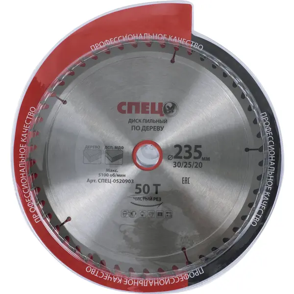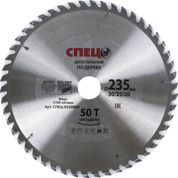 **Диск циркулярный по дереву «Спец»** представляет собой кольцеобразное полотно диаметром 235 мм, на котором расположены зубья (50 шт.) с твердосплавными напайками и компенсационные температурные прорези с финишными отверстиями. В производстве использовалась прочная сталь. Диск предназначен для поперечного и продольного реза толстых заготовок: распиливает древесину, ДСП и МДФ. Устанавливается преимущественно на стол станка. Посадочный диаметр — 30, 25 и 20 мм. Товар изготовлен в Китае. На основании сертификата EAC (Eurasian Conformity / Евразийское соответствие) разрешен к продаже в Таможенном союзе. ### Преимущества и особенности - Чистый рез. - Компенсация температурной деформации стали. - Износостойкость. - Профессиональное качество. Внимание! Перед использованием циркулярного диска по дереву прочитайте инструкцию по применению. Работайте в защитных очках, респираторе, наушниках, перчатках. Перед наладочными работами отключите инструмент от электросети.