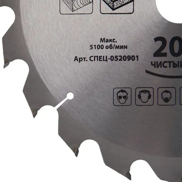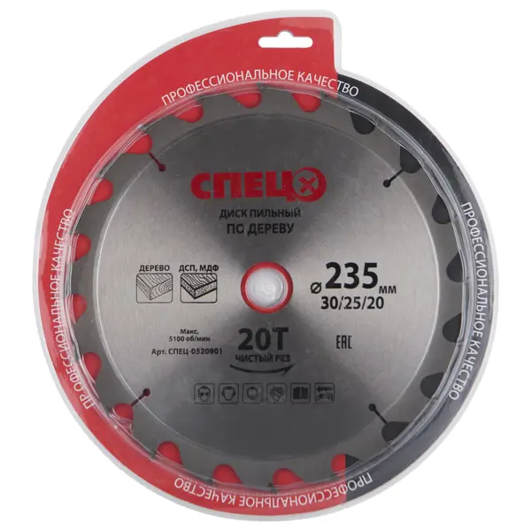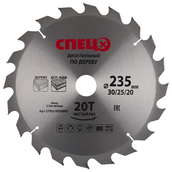 **Диск циркулярный по дереву «Спец»** представляет собой кольцеобразное полотно диаметром 235 мм, на котором расположены зубья (20 шт.) с твердосплавными напайками и компенсационные температурные прорези с финишными отверстиями. В производстве использовалась прочная сталь. Диск предназначен для поперечного и продольного реза толстых заготовок: распиливает древесину, ДСП и МДФ. Устанавливается преимущественно на стол станка. Посадочный диаметр — 30, 25 и 20 мм. Товар изготовлен в Китае. На основании сертификата EAC (Eurasian Conformity / Евразийское соответствие) разрешен к продаже в Таможенном союзе. ### Преимущества и особенности - Чистый рез. - Компенсация температурной деформации стали. - Износостойкость. - Профессиональное качество. Внимание! Перед использованием циркулярного диска по дереву прочитайте инструкцию по применению. Работайте в защитных очках, респираторе, наушниках, перчатках. Перед наладочными работами отключите инструмент от электросети.