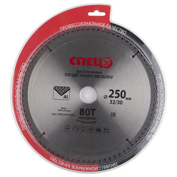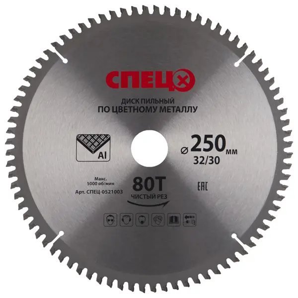 **Диск циркулярный по цветному металлу «Спец»** диаметром 250 мм предназначен для реза алюминиевого, медного, латунного проката. Состоит из кольцеобразного основания, 80 прямых зубьев, усиленных твердосплавными напайками, и компенсационных температурных прорезей. Устанавливается на циркулярную пилу. Посадочный диаметр — 30 и 32 мм. Товар импортируется из Китая. Имеет сертификат EAC (Eurasian Conformity / Евразийское соответствие), который действителен в странах Таможенного союза. ### Преимущества и особенности - Чистота реза. - Износостойкость и надежность. - Отсутствие температурной деформации. - Высокая частота резцов, нулевой угол заточки. Внимание! При эксплуатации пилы с циркулярным диском не пренебрегайте техникой безопасности: используйте средства индивидуальной защиты, меняйте насадки только после отключения инструмента от электросети.