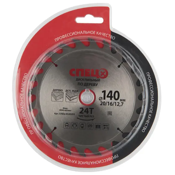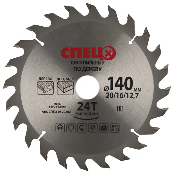 **Диск циркулярный по дереву «Спец»** — стальной круг диаметром 140 мм с 24 зубьями по периметру. Режущая кромка усилена твердосплавными напайками. Посадочный диаметр — 20, 16 и 12,7 мм. Диск используется для реза (продольного и поперечного) заготовок из древесины, МДФ, ДСП. Устанавливается преимущественно на ручную дисковую пилу. Страна производства — Китай. Товар сертифицирован в Таможенном союзе: на полотне стоит аббревиатура EAC (Eurasian Conformity / Евразийское соответствие). ### Преимущества и особенности - Твердосплавные напайки повышают износостойкость и прочность, обеспечивают чистоту пропила. - Прорези компенсируют температурную деформацию стали. - Отверстия на концах прорезей уменьшают риск образования трещин. Внимание! Работы выполняйте в защитных очках, наушниках, респираторе и перчатках. Перед установкой и заменой циркулярного диска убедитесь, что пила не подключена к электросети.
